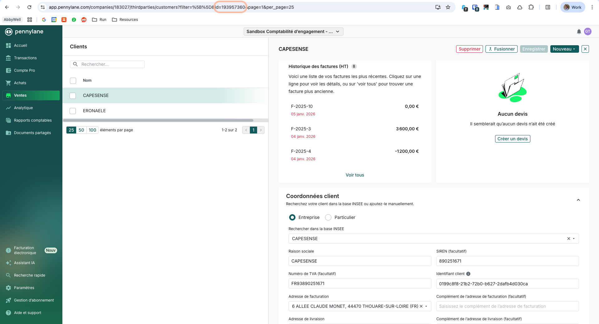 Dans Pennylane, accédez à la fiche client. L'ID apparaît dans l'URL : https://app.pennylane.com/.../customers?id=193957360