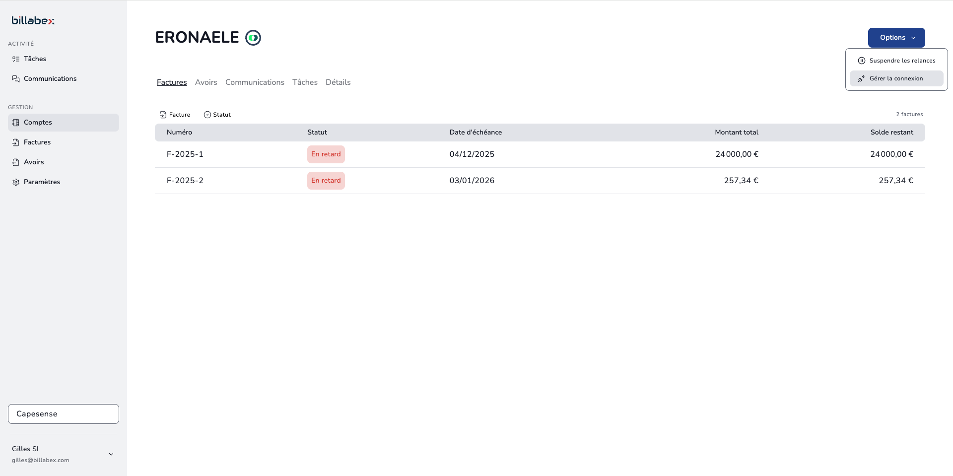 - Consultez quelques données du compte telles que les factures, avoirs, informations, etc.