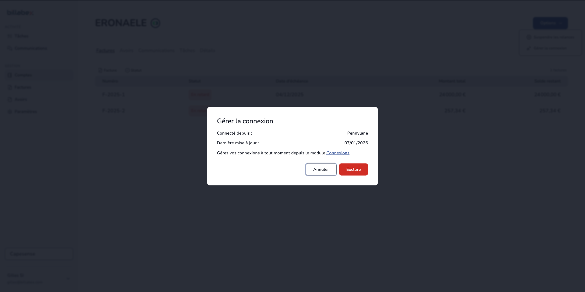 Les données déjà synchronisées restent dans Billabex mais ne seront plus mises à jour.