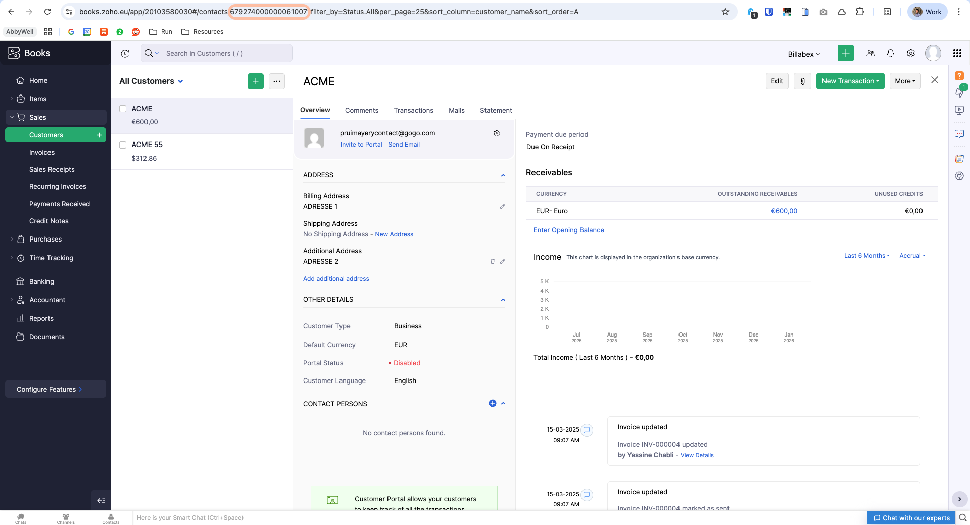 Toute nouvelle facture créée dans Zoho Books apparaît dans Billabex (1 fois par jour)
