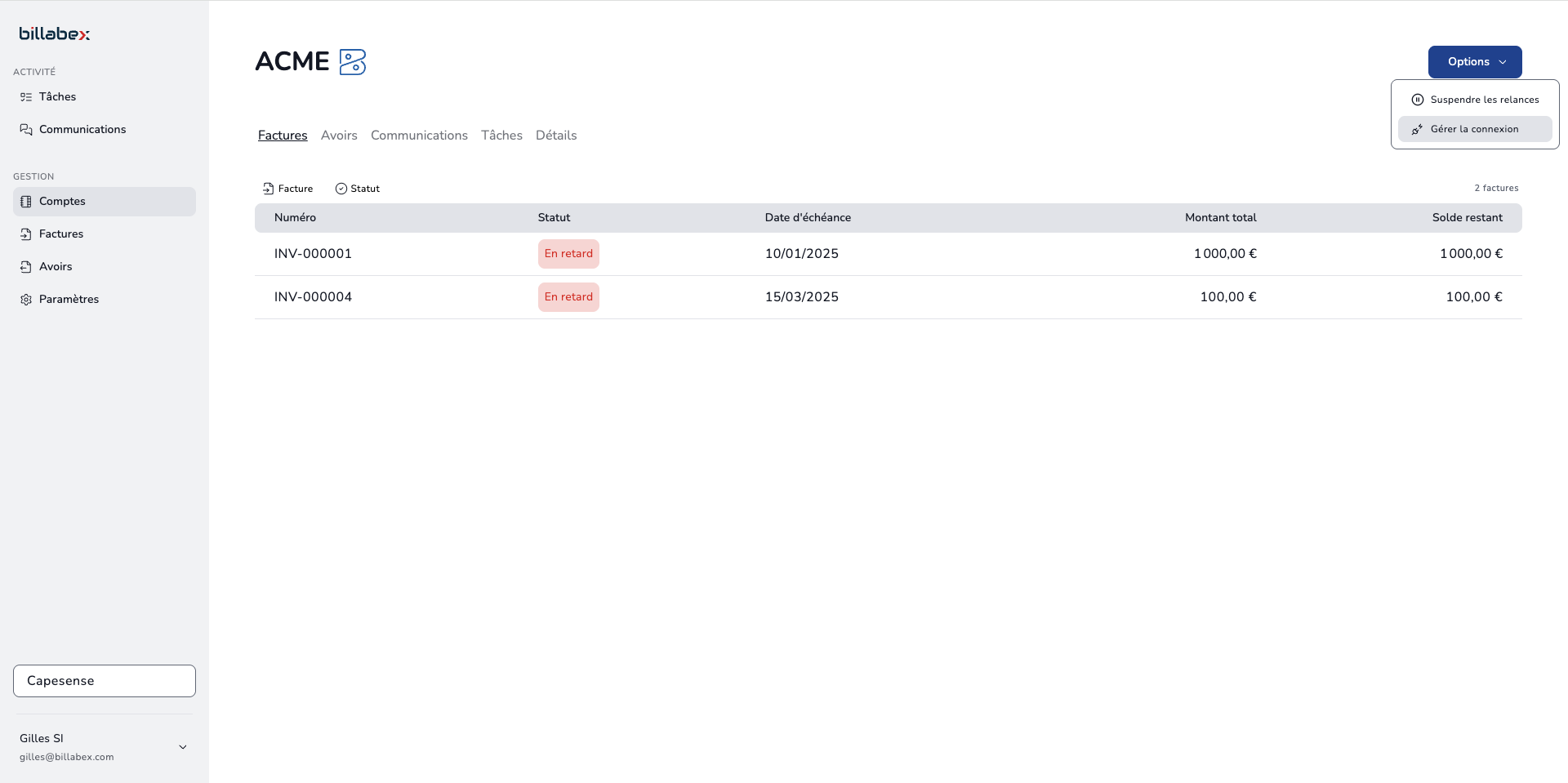 Consultez quelques données du compte telles que les factures, avoirs, informations, etc.